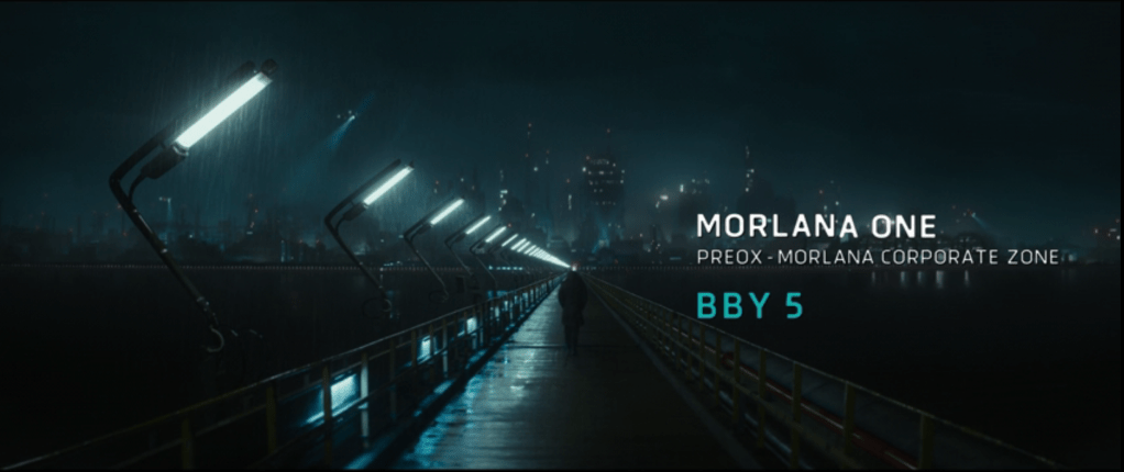 Andor begins with a low angle shot of lights set against a dark and stormy night (Figure 1). As the camera tracks from left to right, new lights appear and disappear. At first the appearances of these lights are punctuated by the score, but as the camera begins to pan to the right the lights and the music fall out of sync. As the camera continues to track and pan, a human figure becomes visible, walking parallel to the lights along a causeway towards a cityscape dimly outlined against the rain and the darkness. A cut to a second shot, at a lower angle, reorients the camera and the viewer. This shot focuses on the hooded figure’s legs set against a perspectival line opposite the one created in the first shot by the convergence of the lights, the causeway, and the camera’s movement. Rather than converging on a point in space ahead of this figure, this second, new perspectival line converges on a point behind him (Figure 2). Another cut presents a wider view of the causeway and the lights vanishing in the distance, of the figure who continues to move towards the vanishing point, and of the cityscape. This third shot offers neither forward nor backward movement but only a crane up that centers the vanishing point in the frame and positions the hooded figure just below it. As the camera settles in space and the shot concludes in time, a legend appears on the right side of the frame. The legend adds to the frame a second organizational scheme (the vanishing point being the first), one that divides it vertically into three unequal sections. The left hand section mainly contains the lights with which we began. The middle, and narrowest, section articulates the convergence of the lights, the street, the camera’s movement, and the hooded figure with the cityscape. The right hand section, again, contains three lines of text set against a darkness barely broken by the distant cityscape: “Morlana One/Preox-Morlana Corporate Zone/BBY 5” (Figure 3).